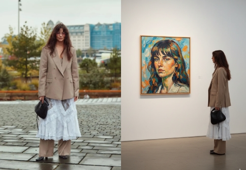 In a minimalist white art gallery, a person stands gracefully, slightly turned toward a large impressionist-style oil painting on the wall. Their pose feels natural and relaxed, as if quietly admiring the artwork. The painting is expressive and colorful, depicting the same person as the main subject in an impressionist style. Warm spotlighting creates a soft, elegant atmosphere, blending realism with artistic emotion.